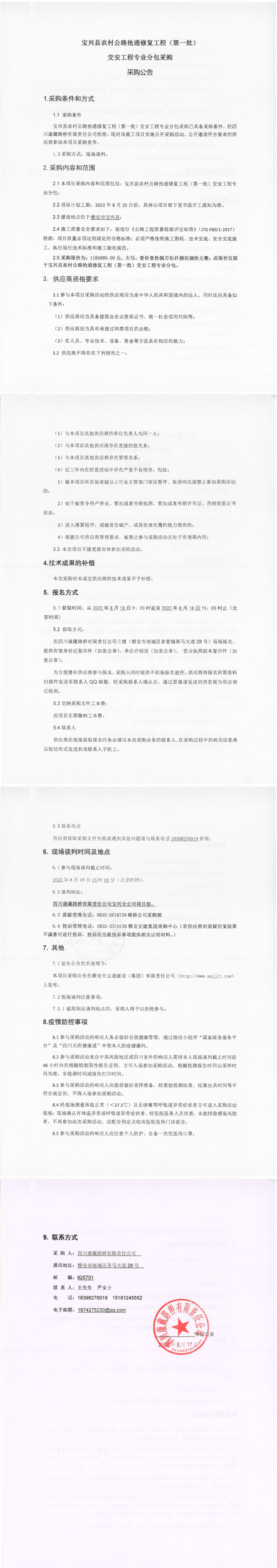 四川康藏路橋有限責(zé)任公司寶興縣農(nóng)村公路搶通修復(fù)工程(第一批)交安工程專業(yè)分包采購采購公告