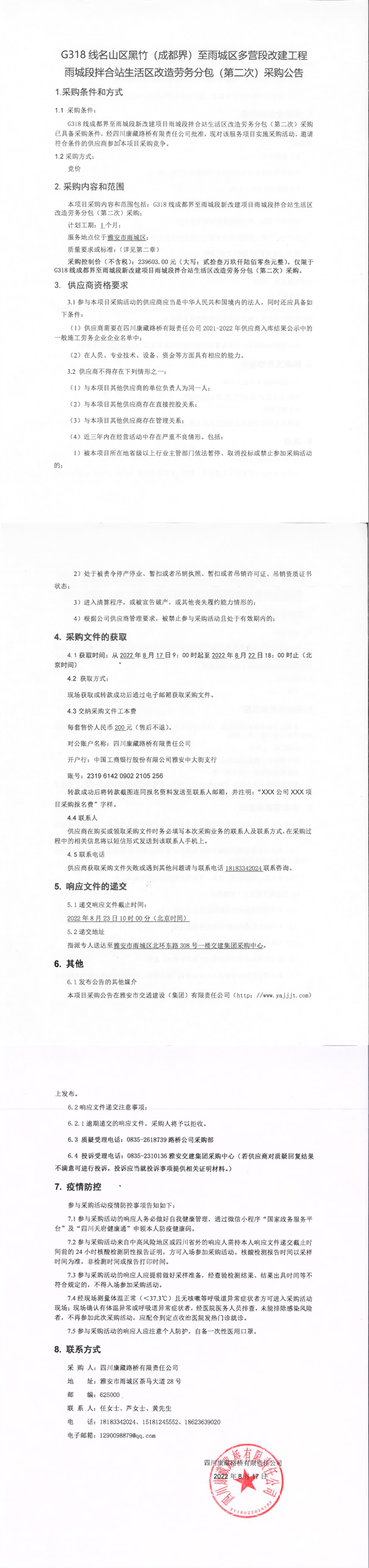 四川康藏路橋有限責(zé)任公司G318線名山區(qū)黑竹(成都界)至雨城區(qū)多營(yíng)段改建工程雨城段拌合站生活區(qū)改造勞務(wù)分包(第二次)采購(gòu)公告