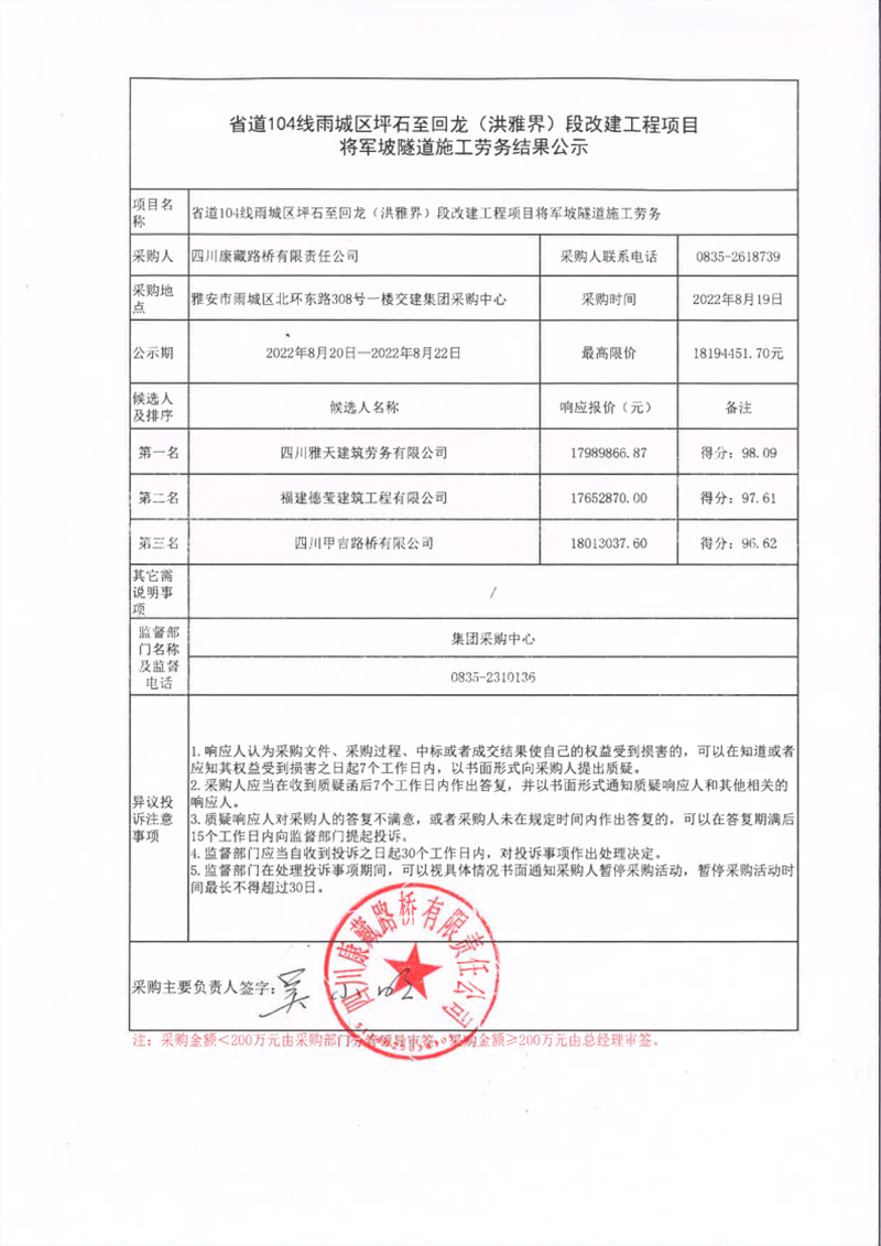 四川康藏路橋有限責任公司省道104線雨城區(qū)坪石至回龍(洪雅界)段改建工程項目將軍坡隧道施工勞務(wù)結(jié)果公示