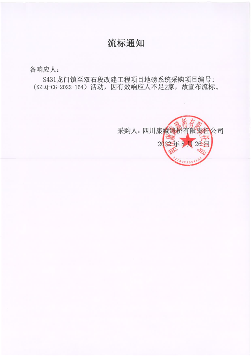 四川康藏路橋有限責任公司S431龍門鎮(zhèn)至雙石段改建工程項目地磅系統(tǒng)采購項目流標通知