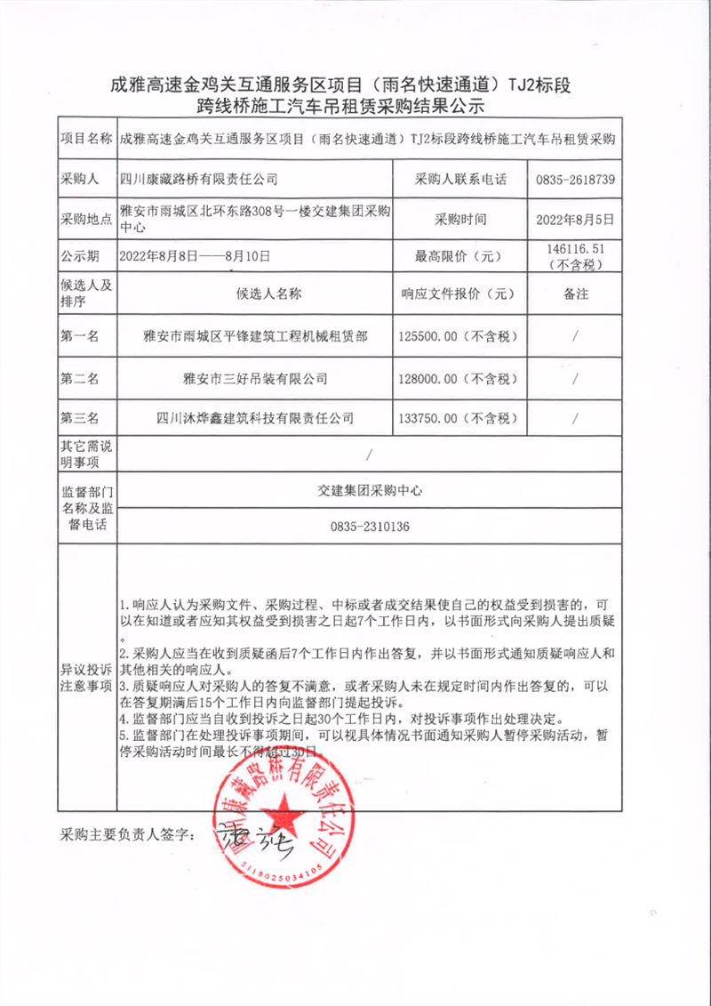四川康藏路橋有限責(zé)任公司成雅高速金雞關(guān)互通服務(wù)區(qū)項目(雨名快速通道)TJ2標段跨線橋施工汽車吊租賃采購結(jié)果公示