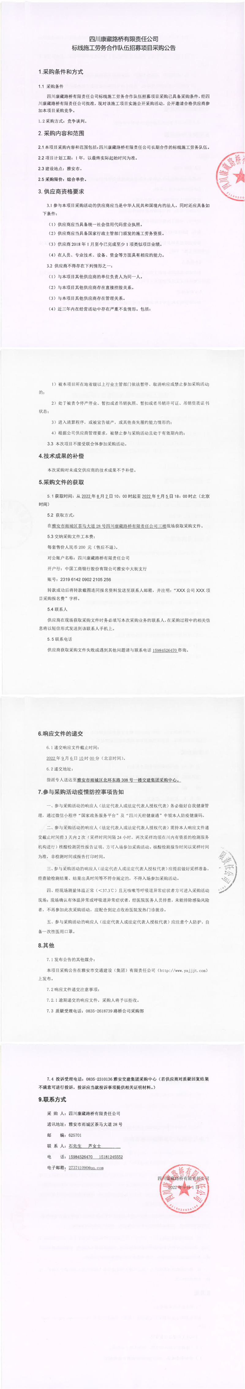 四川康藏路橋有限責(zé)任公司標(biāo)線施工勞務(wù)合作隊(duì)伍招募項(xiàng)目采購(gòu)公告