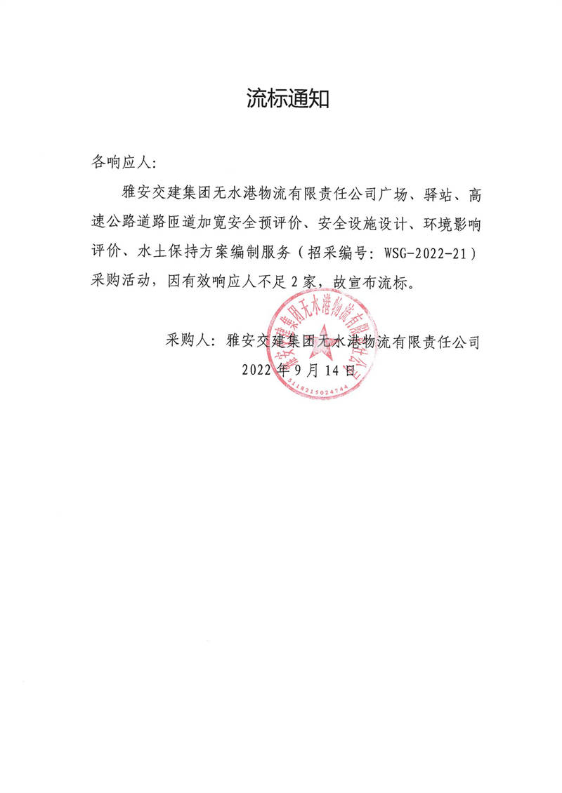 雅安交建集團(tuán)無水港物流有限責(zé)任公司廣場、驛站、高速公路道路匝道加寬安全預(yù)評價、安全設(shè)施設(shè)計、環(huán)境影響評價、水土保持方案編制服務(wù)采購流標(biāo)通知