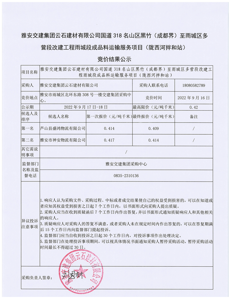 雅安交建集團(tuán)云石建材有限公司國道318名山區(qū)黑竹(成都界)至雨城區(qū)多營段改建工程雨城段成品料運輸服務(wù)項目(皇茶大道拌和站)競價結(jié)果公示