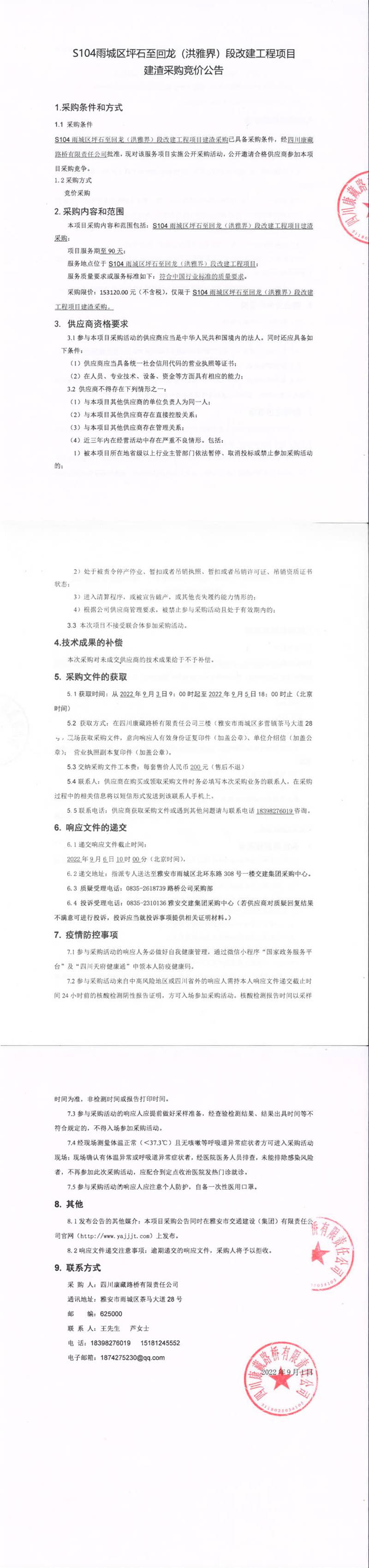 四川康藏路橋有限責任公司S104雨城區(qū)坪石至回龍(洪雅界)段改建工程項目建渣采購競價公告