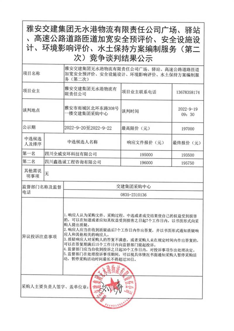 雅安交建集團(tuán)無水港物流有限責(zé)任公司廣場、驛站、高速公路道路匝道加寬安全預(yù)評價(jià)、安全設(shè)施設(shè)計(jì)、環(huán)境影響評價(jià)、水土保持方案編制服務(wù)(第二次)競爭談判結(jié)果公示