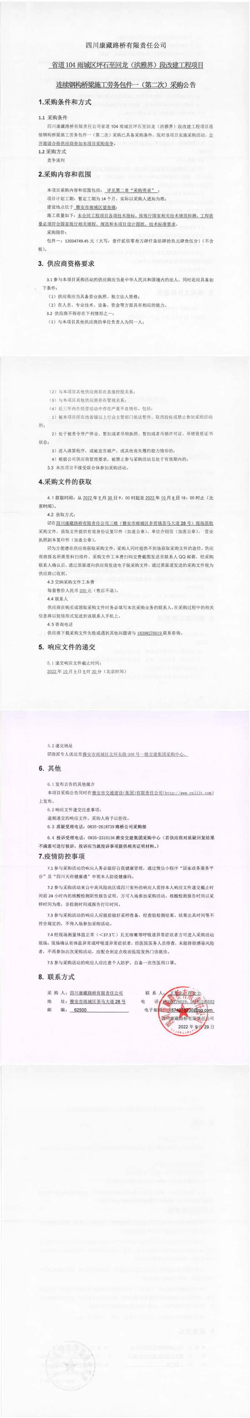 四川康藏路橋有限責任公司省道104雨城區(qū)坪石至回龍(洪雅界)段改建工程項目連續(xù)鋼構(gòu)橋梁施工勞務包件一(第二次)采購公告
