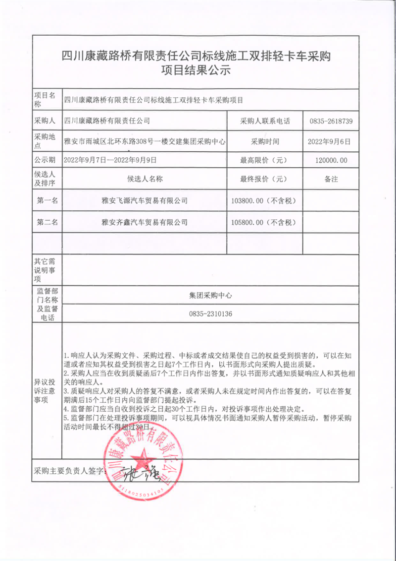 四川康藏路橋有限責(zé)任公司標(biāo)線施工雙排輕卡車(chē)采購(gòu)項(xiàng)目結(jié)果公示