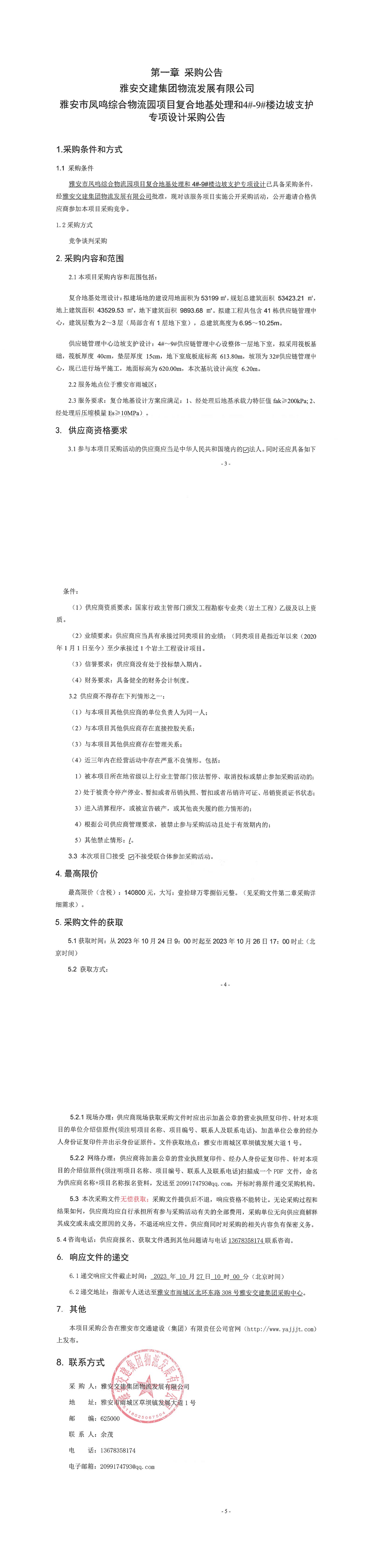 雅安交建集團物流發(fā)展有限公司雅安市鳳鳴綜合物流園項目復合地基處理和4#-9#樓邊坡支護專項設(shè)計采購公告