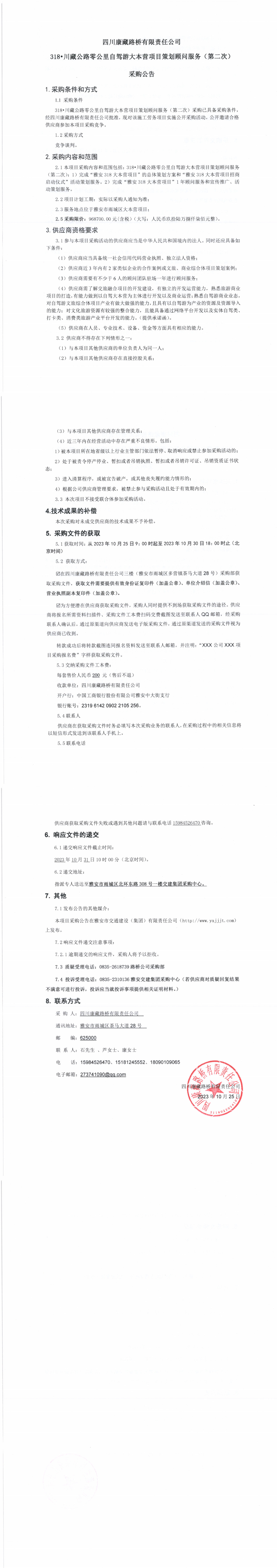 四川康藏路橋有限責(zé)任公司318•川藏公路零公里自駕游大本營項目策劃顧問服務(wù)(第二次)采購公告