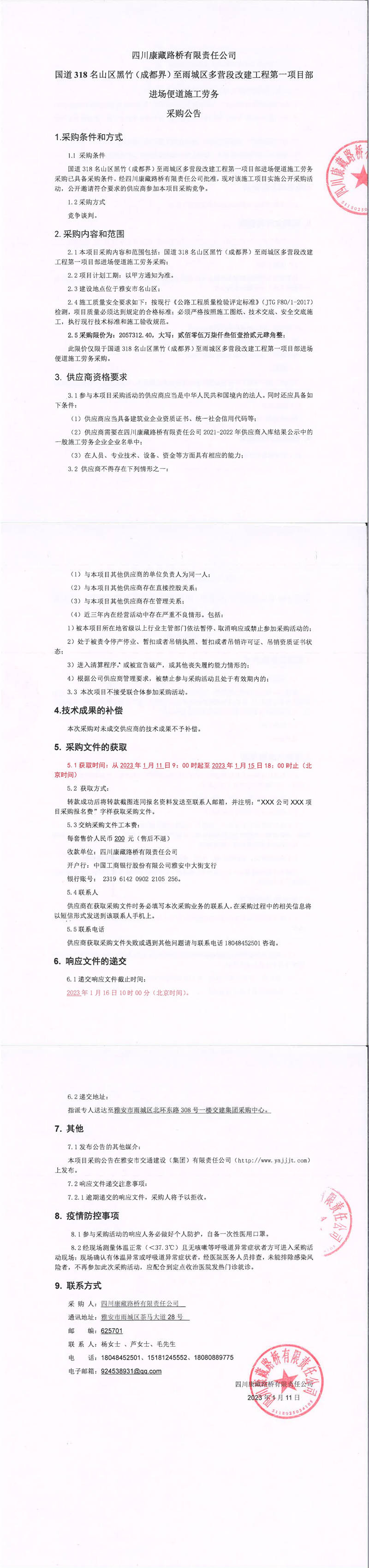 四川康藏路橋有限責(zé)任公司S431蘆山縣龍門至雙石段改建工程項目邊坡防護工程施工勞務(wù)采購競爭談判結(jié)果公示