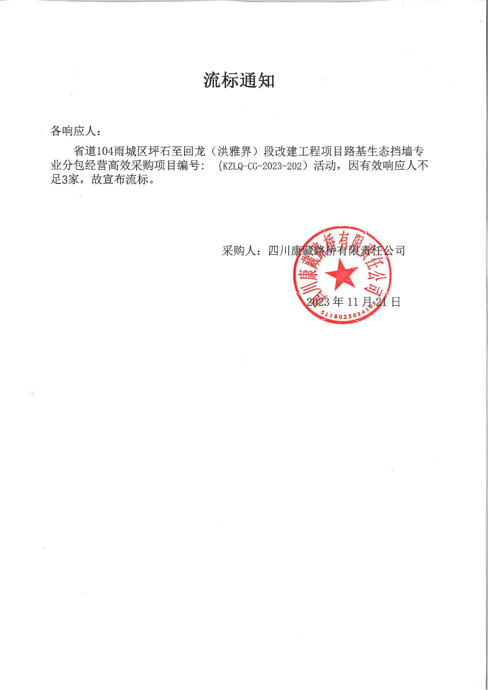 四川康藏路橋有限責(zé)任公司省道104雨城區(qū)坪石至回龍(洪雅界)段改建工程項目路基生態(tài)擋墻專業(yè)分包經(jīng)營高效采購流標(biāo)通知