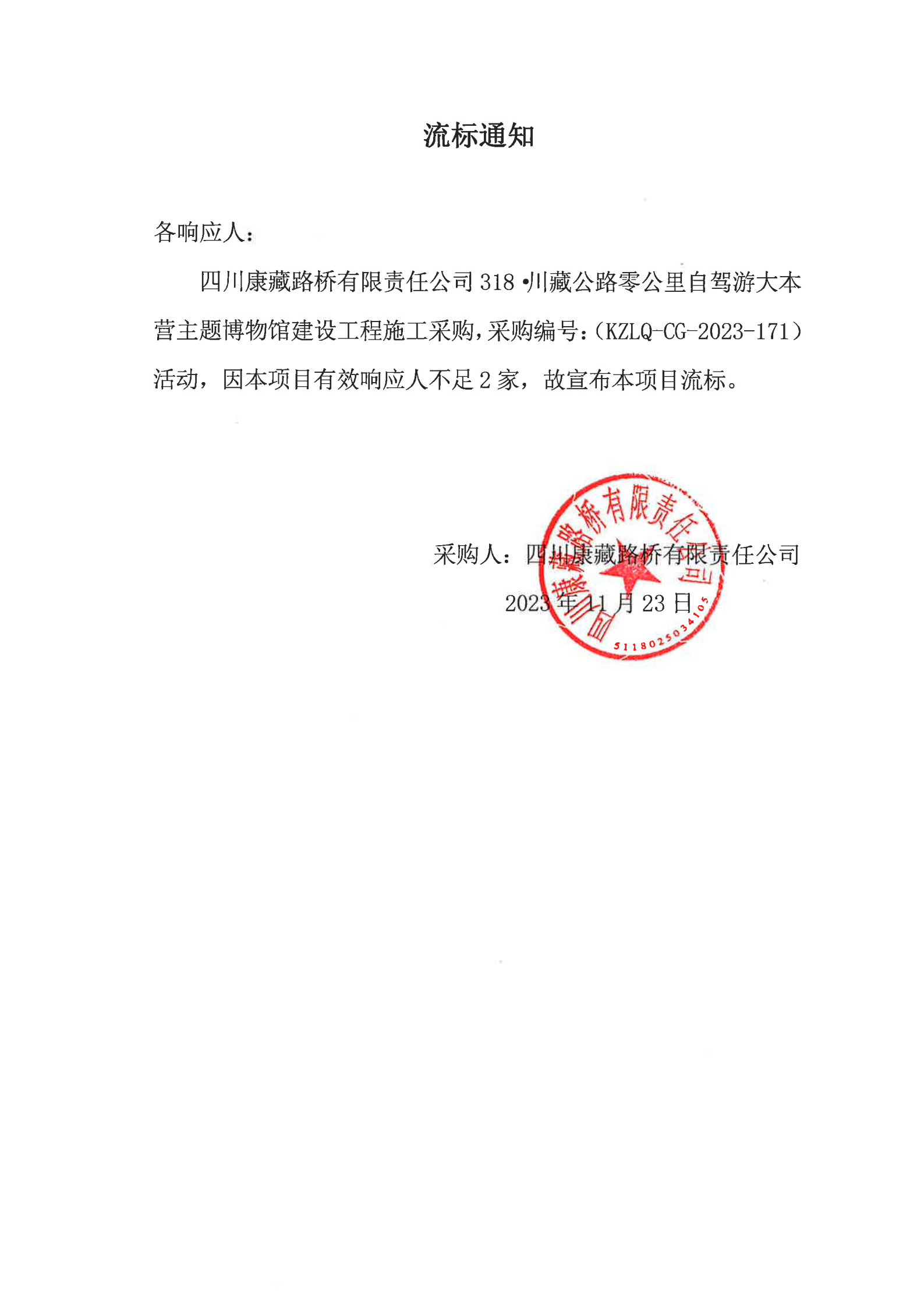 四川康藏路橋有限責(zé)任公司318·川藏公路零公里自駕游大本營(yíng)主題博物館建設(shè)工程施工采購流標(biāo)通知