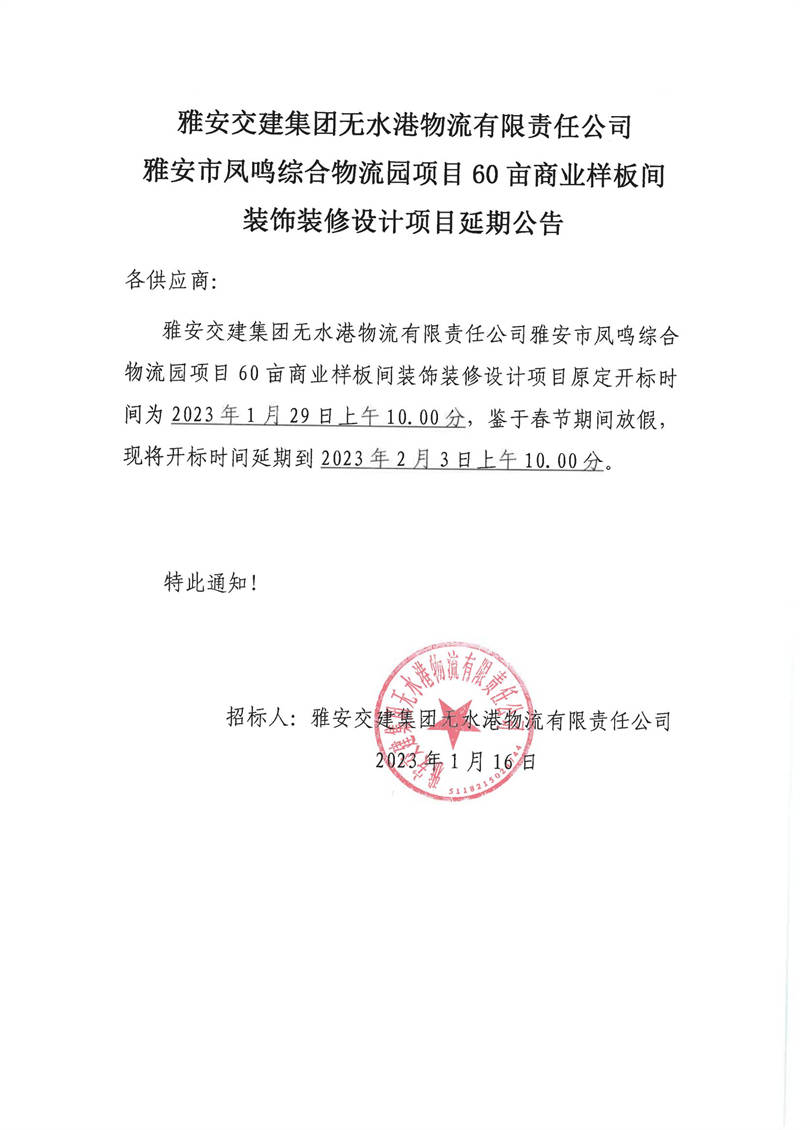 雅安交建集團(tuán)無水港物流有限責(zé)任公司雅安市鳳鳴綜合物流園項目60畝商業(yè)樣板間裝飾裝修設(shè)計項目延期公告