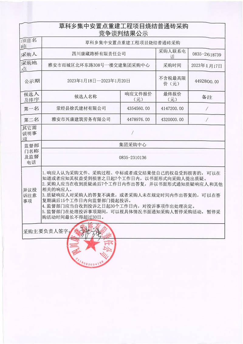 四川康藏路橋有限責(zé)任公司草科鄉(xiāng)集中安置點(diǎn)重建工程項(xiàng)目燒結(jié)普通磚采購競爭談判結(jié)果公示