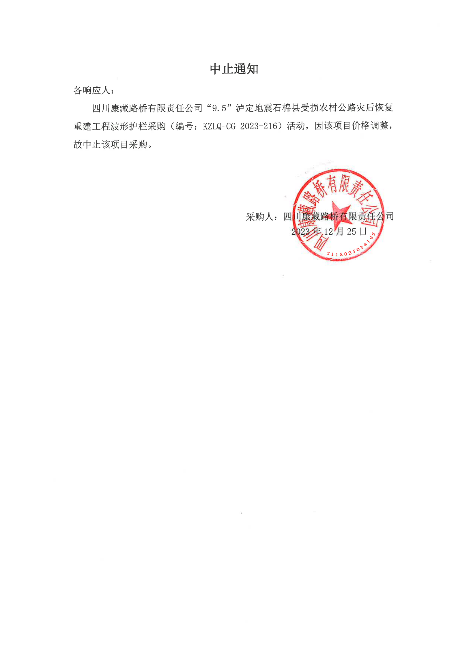 四川康藏路橋有限責任公司“9.5”瀘定地震石棉縣受損農村公路災后恢復重建工程波形護欄采購中止通知
