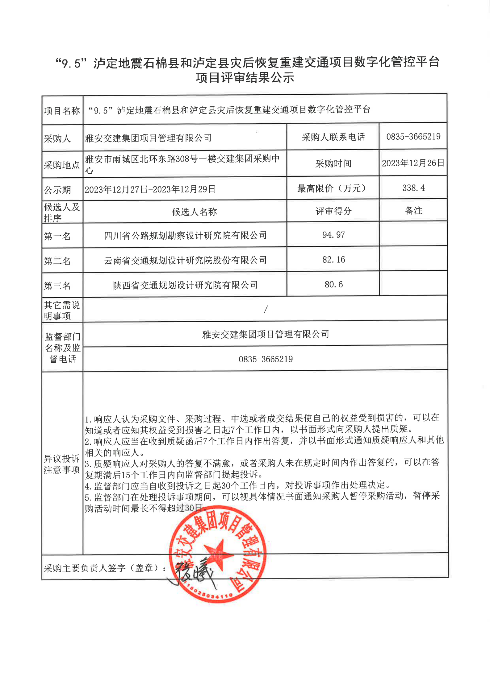 雅安交建集團項目管理有限公司“9.5”瀘定地震石棉縣和瀘定縣災后恢復重建交通項目數(shù)字化管控平臺項目評審結果公示