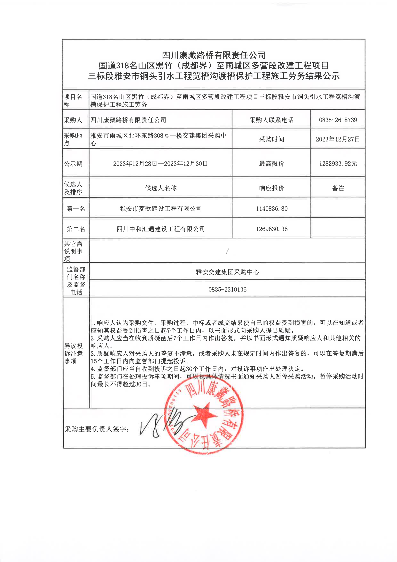 四川康藏路橋有限責(zé)任公司國道318名山區(qū)黑竹(成都界)至雨城區(qū)多營段改建工程項(xiàng)目三標(biāo)段雅安市銅頭引水工程筧槽溝渡槽保護(hù)工程施工勞務(wù)結(jié)果公示