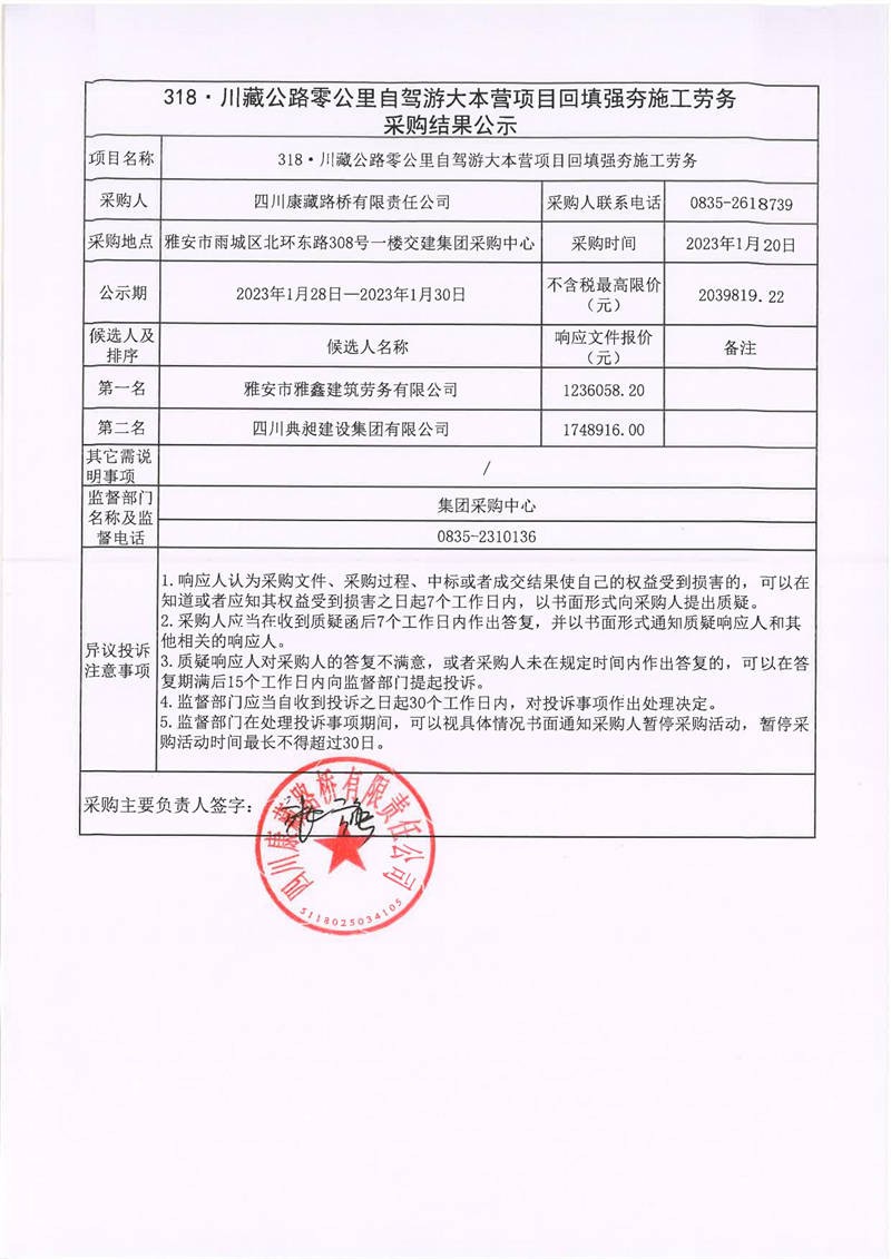 四川康藏路橋有限責任公司318.川藏公路零公里自駕游大本營項目回填強夯施工勞務采購結(jié)果公示