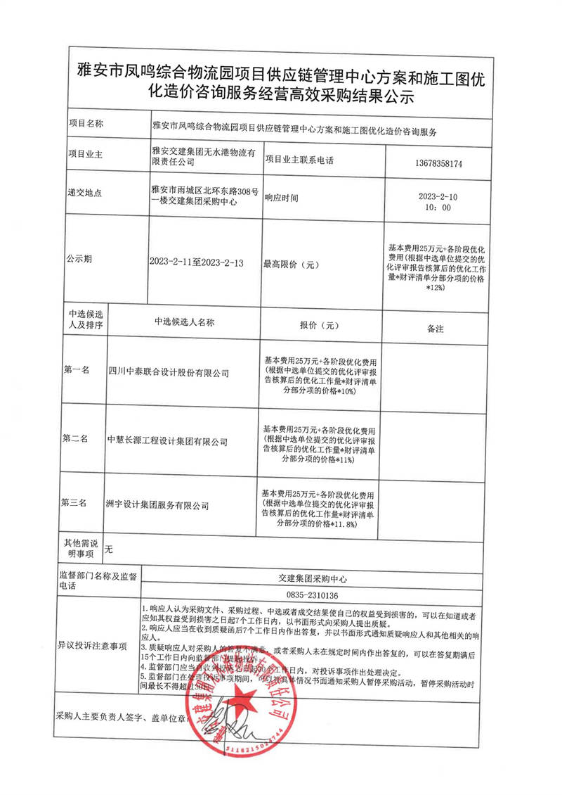 雅安交建集團(tuán)無(wú)水港物流有限責(zé)任公司雅安市鳳鳴綜合物流園項(xiàng)目供應(yīng)鏈管理中心方案和施工圖優(yōu)化造價(jià)咨詢服務(wù)經(jīng)營(yíng)高效采購(gòu)結(jié)果公示