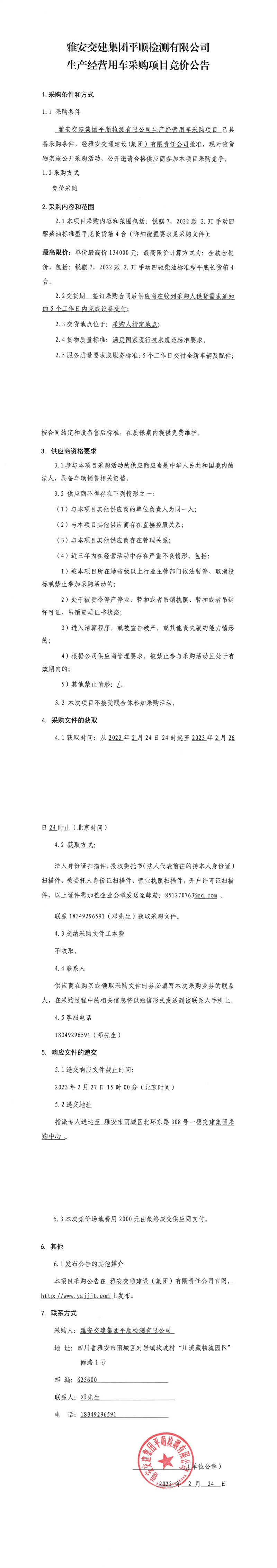 雅安交建集團(tuán)平順檢測(cè)有限公司生產(chǎn)經(jīng)營(yíng)用車采購(gòu)項(xiàng)目競(jìng)價(jià)公告