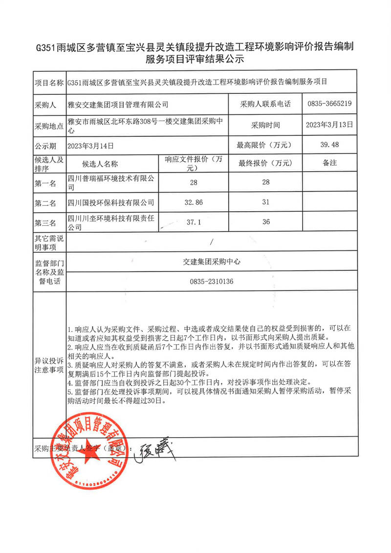 雅安交建集團(tuán)項(xiàng)目管理有限公司G351雨城區(qū)多營(yíng)鎮(zhèn)至寶興縣靈關(guān)鎮(zhèn)段提升改造工程環(huán)境影響評(píng)價(jià)報(bào)告編制服務(wù)項(xiàng)目結(jié)果公示