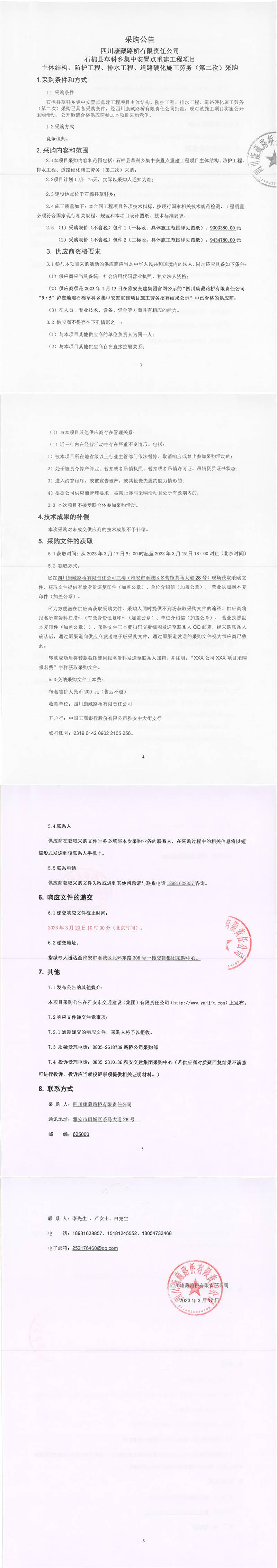 四川康藏路橋有限責(zé)任公司石棉草科鄉(xiāng)集中安置點(diǎn)重建工程項(xiàng)目主體結(jié)構(gòu)、防護(hù)工程、排水工程、道路硬化施工勞務(wù)(第二次)采購(gòu)公告