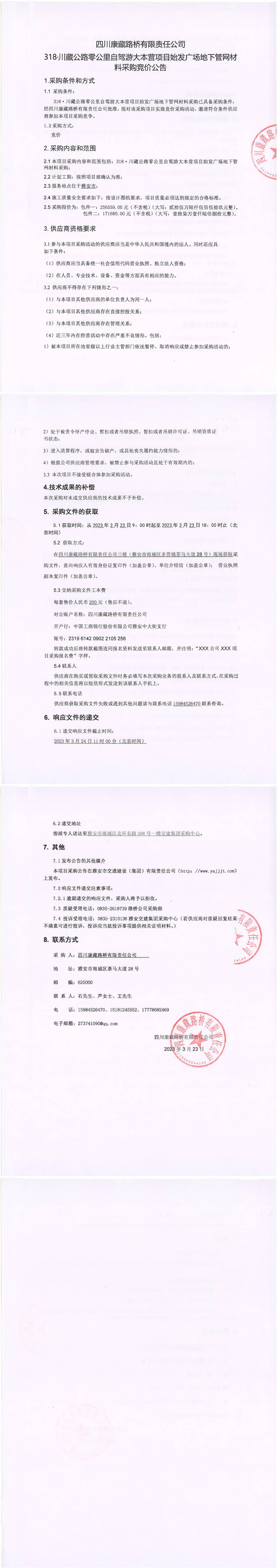 四川康藏路橋有限責任公司318·川藏公路零公里自駕游大本營項目始發(fā)廣場地下管網(wǎng)材料采購競價公告