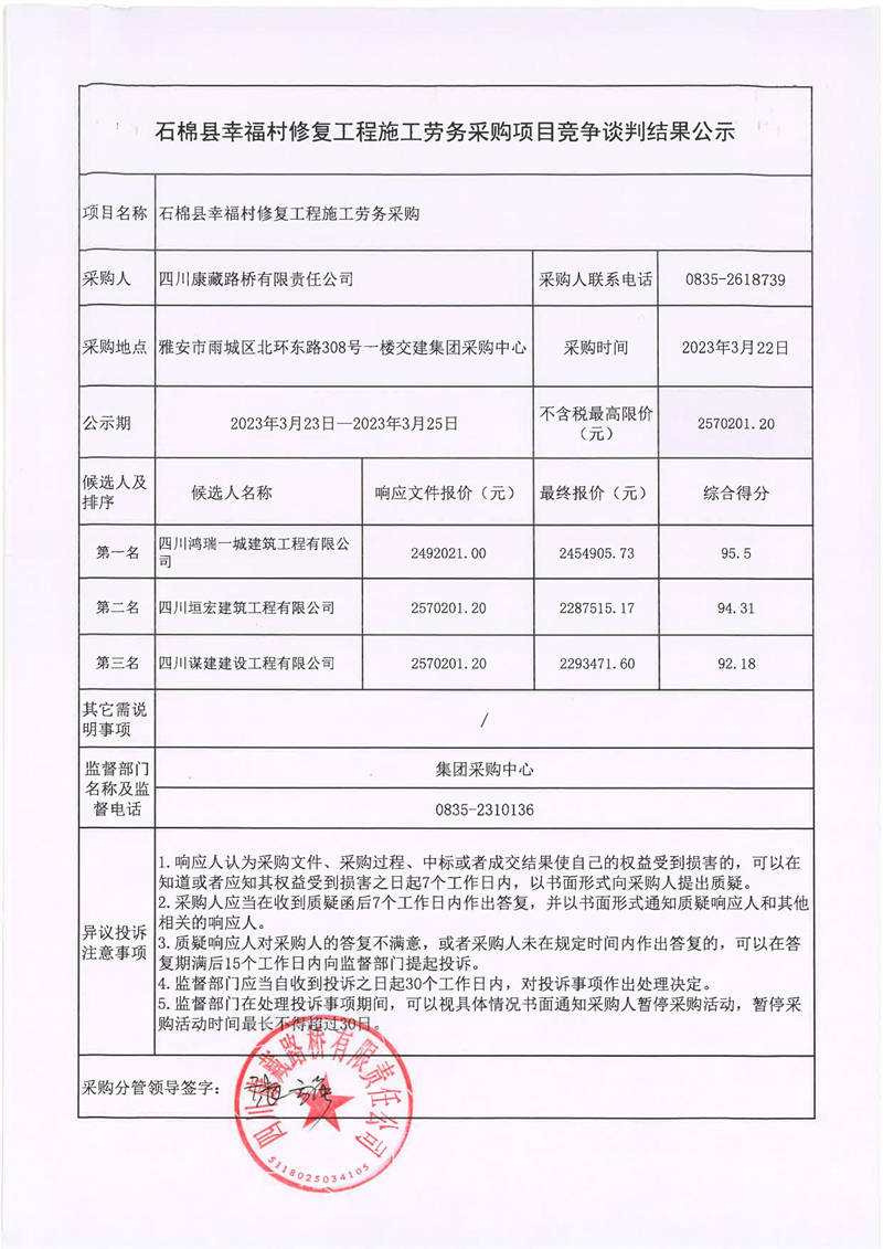 四川康藏路橋有限責(zé)任公司石棉縣幸福村修復(fù)工程施工勞務(wù)采購項(xiàng)目競爭談判結(jié)果公示