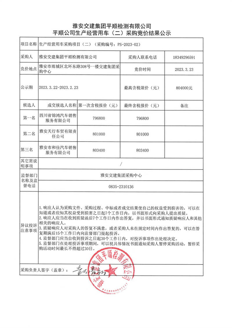 雅安交建集團平順檢測有限公司平順公司生產(chǎn)經(jīng)營用車(三)采購競價結(jié)果公示