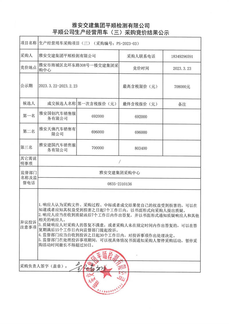 雅安交建集團(tuán)平順檢測有限公司平順公司生產(chǎn)經(jīng)營用車(三)采購競價結(jié)果公示