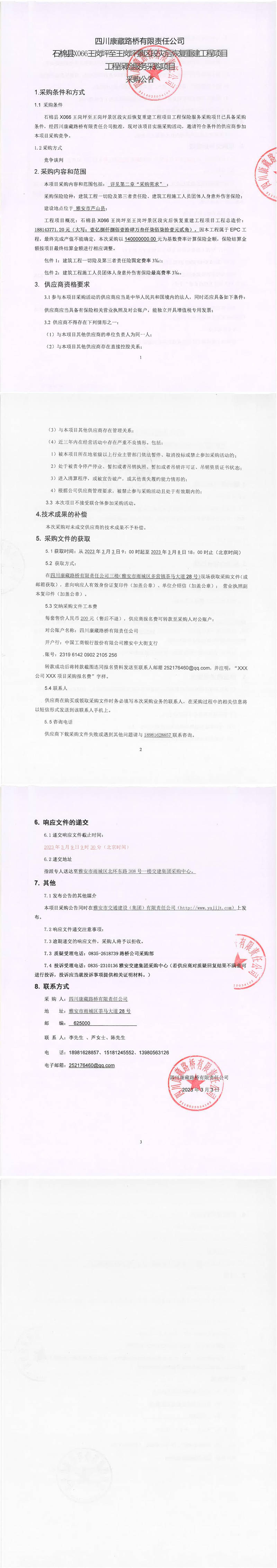 四川康藏路橋有限責(zé)任公司石棉縣X066王崗坪至王崗坪景區(qū)段災(zāi)后恢復(fù)重建工程項(xiàng)目工程保險服務(wù)采購公告