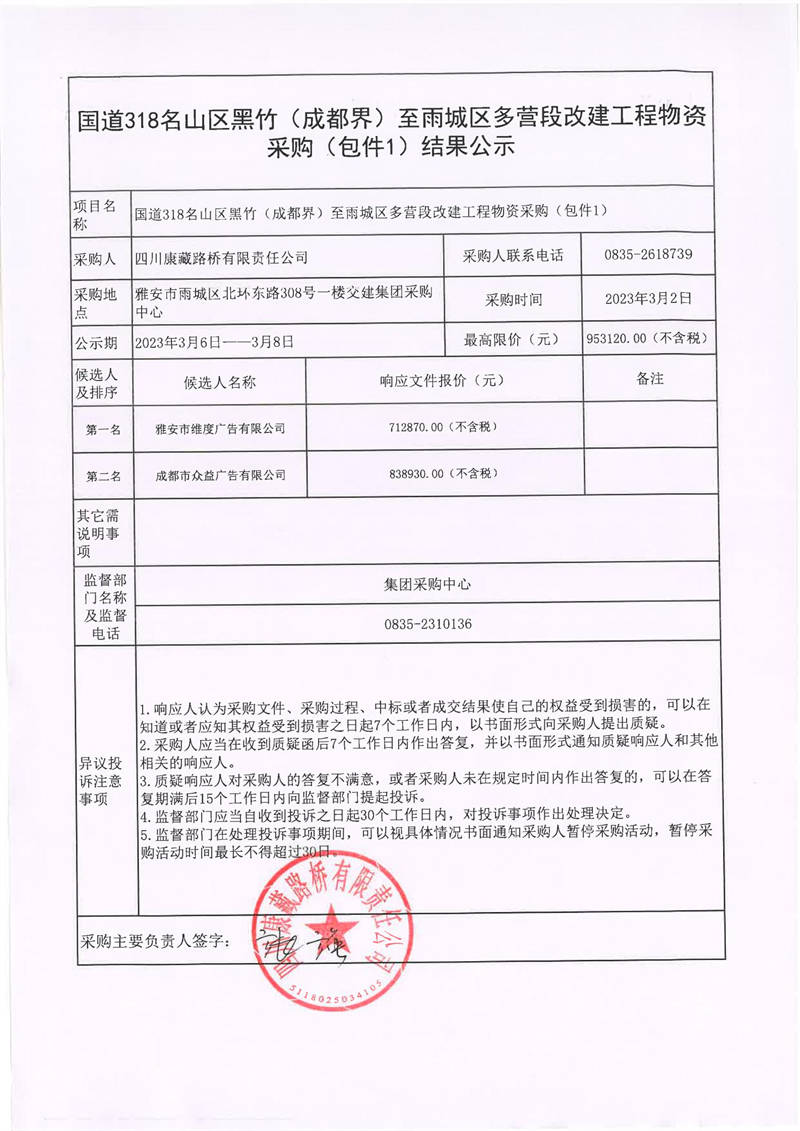 四川康藏路橋有限責任公司國道318名山區(qū)黑竹(成都界)至雨城區(qū)多營段改建工程物資采購(包件1)結果公示