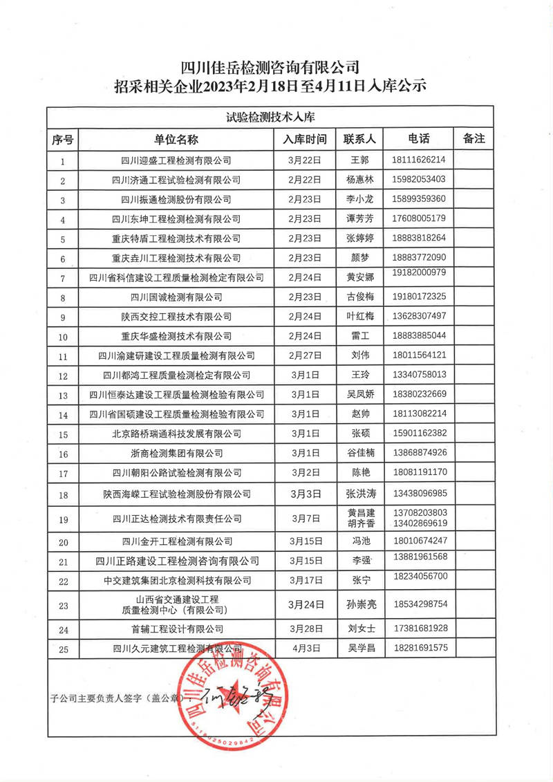 四川佳岳檢測(cè)咨詢有限公司(試驗(yàn)檢測(cè)勞務(wù)供應(yīng)商庫)2023年2月18日至4月11日入庫結(jié)果公示