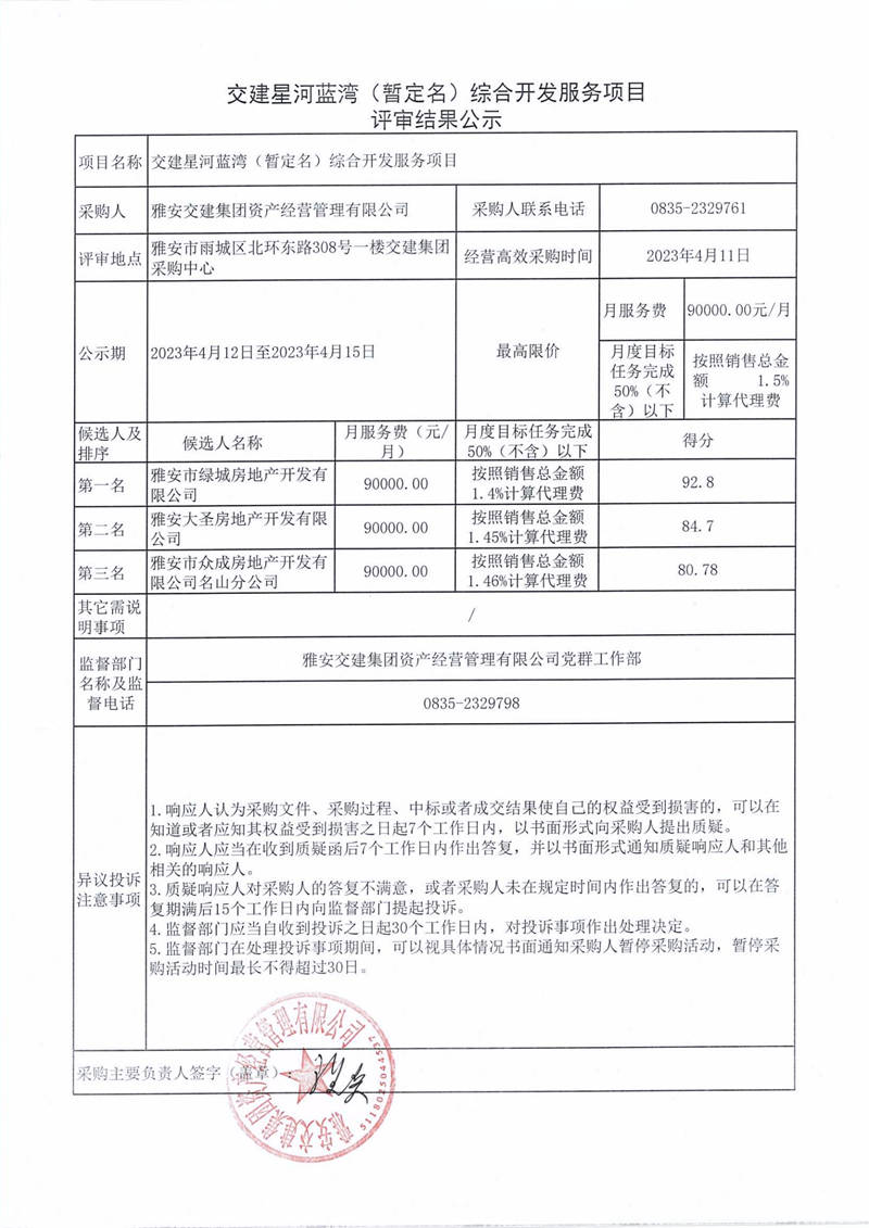 雅安交建集團(tuán)資產(chǎn)經(jīng)營管理有限公司交建星河藍(lán)灣(暫定名)綜合開發(fā)服務(wù)項(xiàng)目評審結(jié)果公示