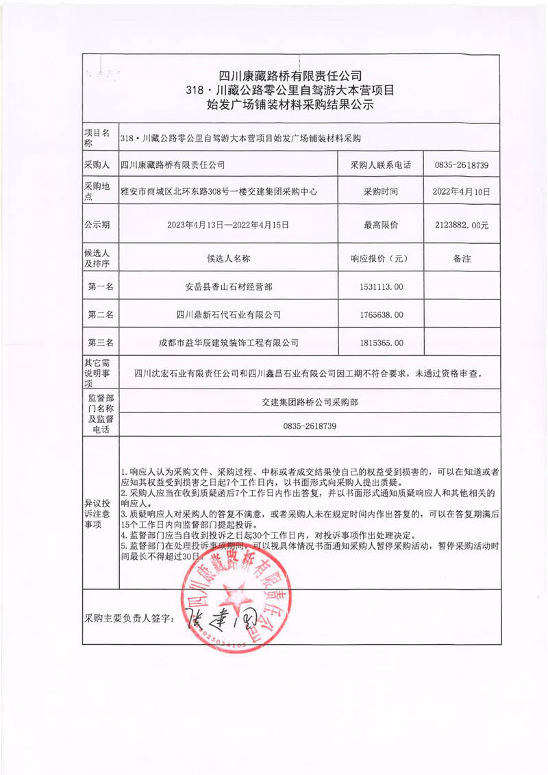 四川康藏路橋有限責(zé)任公司318·川藏公路零公里自駕游大本營項(xiàng)目始發(fā)廣場鋪裝材料采購結(jié)果公示
