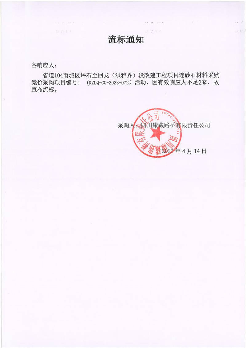 四川康藏路橋有限責(zé)任公司省道104雨城區(qū)坪石至回龍(洪雅界)段改建工程項(xiàng)目連砂石材料采購(gòu)流標(biāo)通知