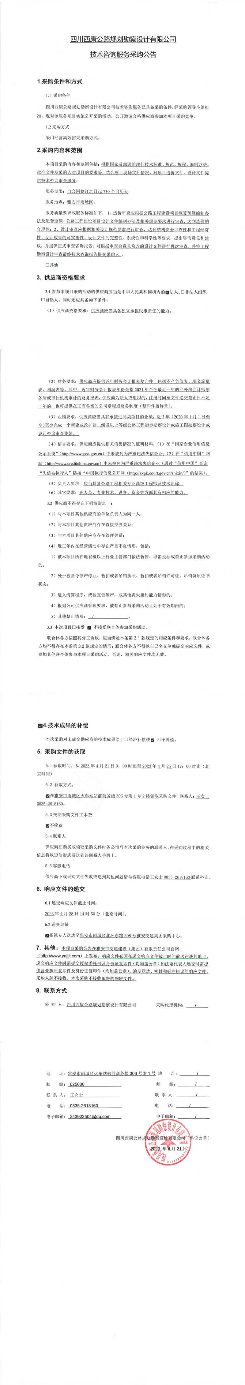 四川西康公路規(guī)劃勘察設計有限公司技術(shù)服務采購公告