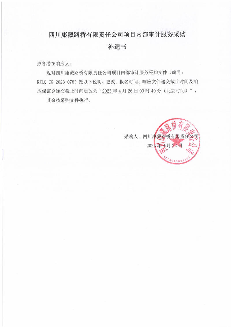 四川康藏路橋有限責(zé)任公司項(xiàng)目?jī)?nèi)部審計(jì)服務(wù)采購(gòu)補(bǔ)遺書