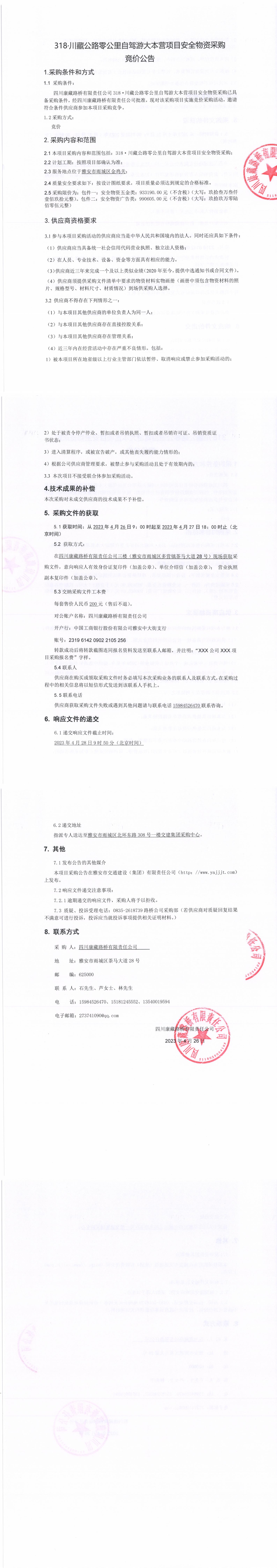 四川康藏路橋有限責(zé)任公司318·川藏公路零公里自駕游大本營項(xiàng)目安全物資采購競(jìng)價(jià)公告
