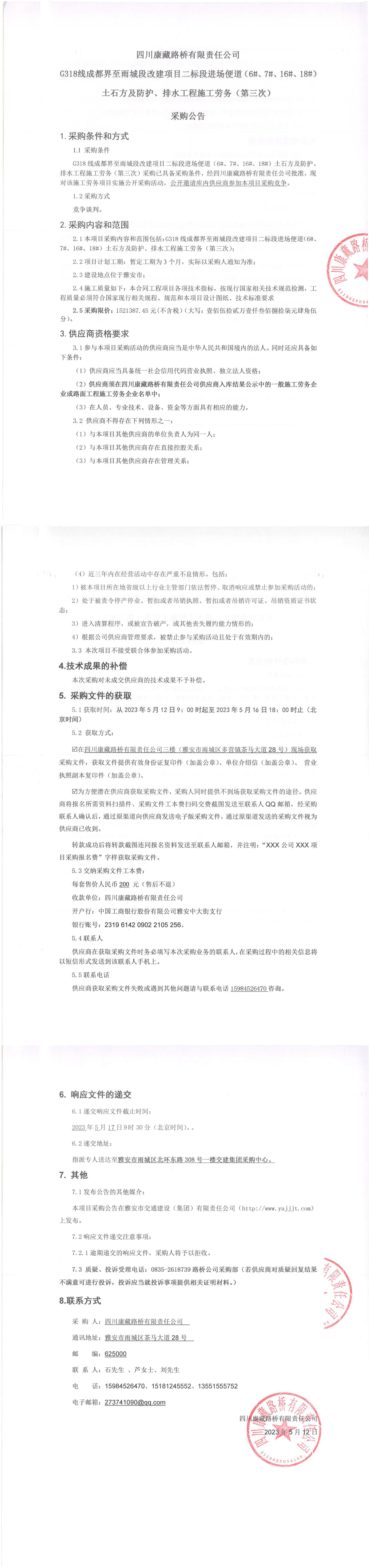四川康藏路橋有限責任公司G318線成都至雨城段改建項目二標段進場便道(6#、7#、16#、18#)土石方及防護、排水工程施工勞務(第三次)采購公告