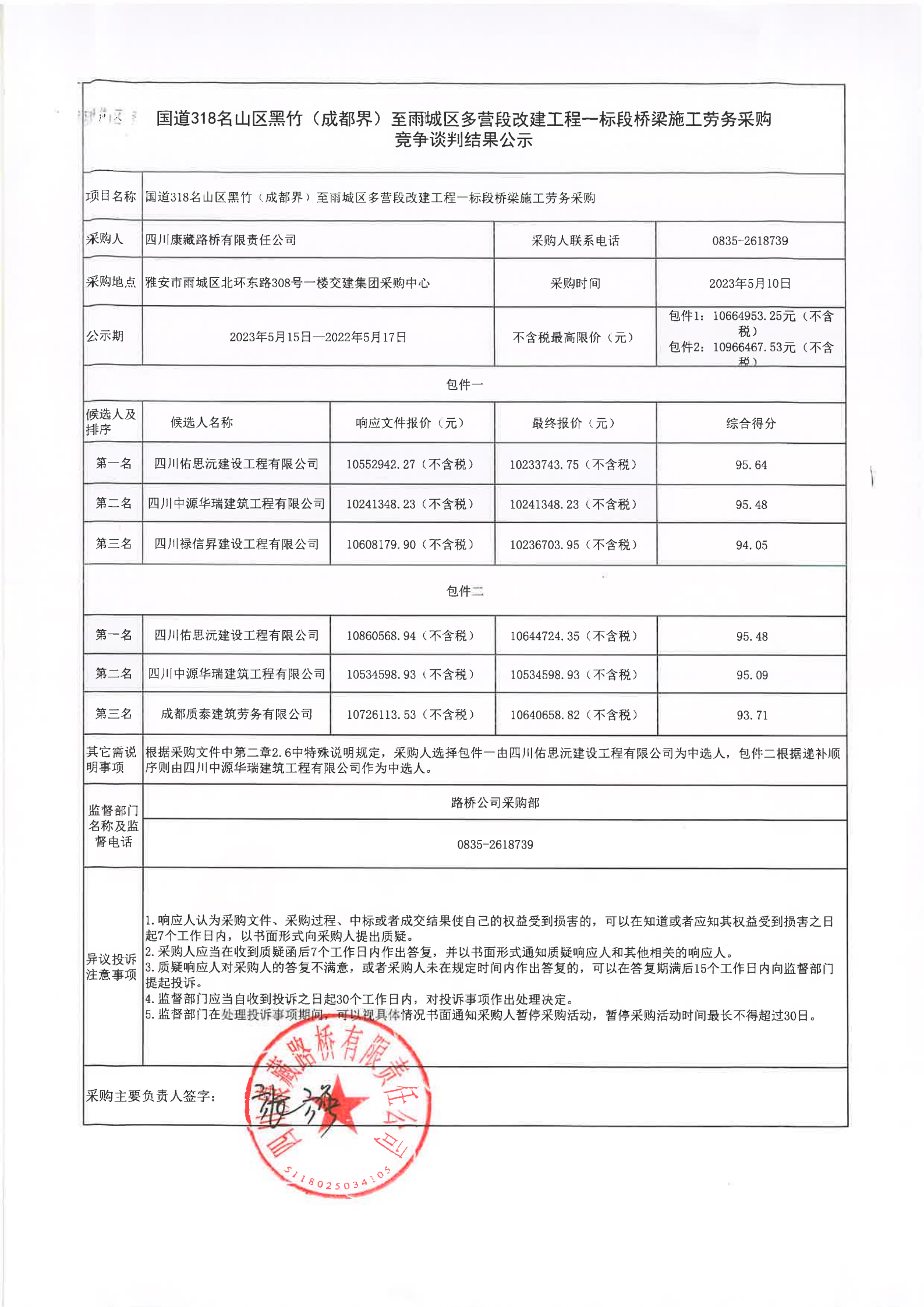 四川康藏路橋有限責(zé)任公司國(guó)道318名山區(qū)黑竹(成都界)雨城區(qū)多營(yíng)段改建工程一標(biāo)段橋梁施工勞務(wù)采購(gòu)競(jìng)爭(zhēng)談判結(jié)果公示