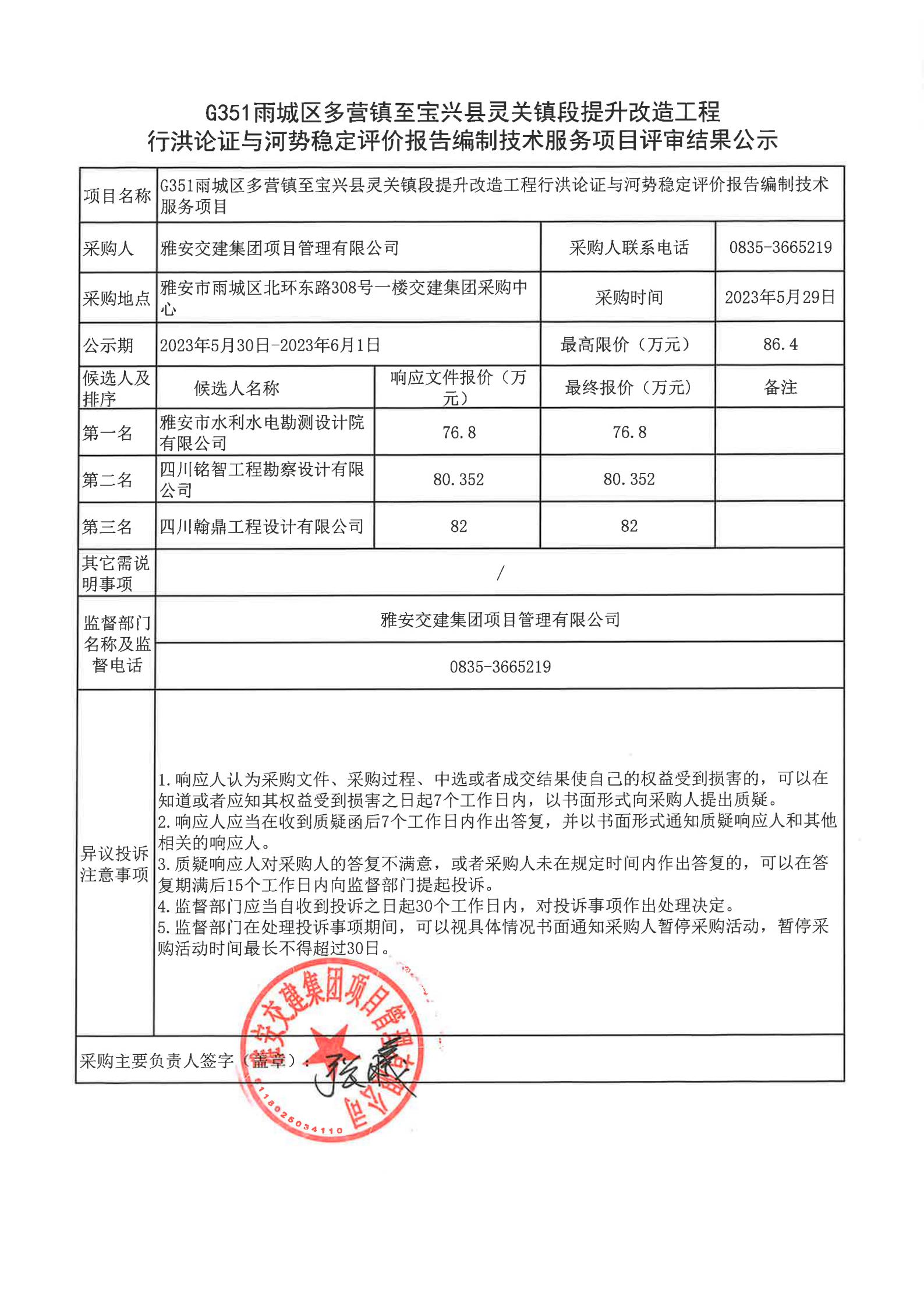 雅安交建集團項目管理有限公司G351雨城區(qū)多營鎮(zhèn)至寶興縣靈關鎮(zhèn)段提升改造工程行洪論證與河勢穩(wěn)定評價報告編制技術服務項目評審結果公示