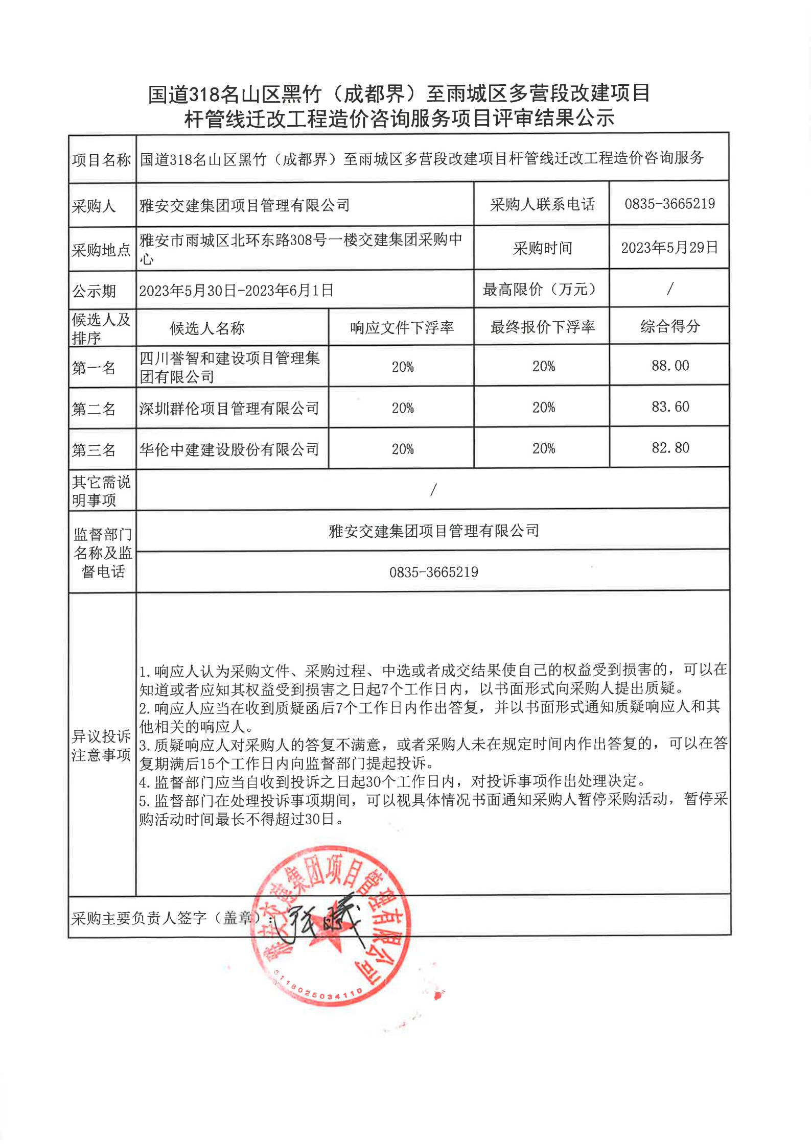雅安交建集團(tuán)項(xiàng)目管理有限公司國(guó)道318名山區(qū)黑竹(成都界)至雨城區(qū)多營(yíng)段改建項(xiàng)目桿管線(xiàn)遷改工程造價(jià)咨詢(xún)服務(wù)項(xiàng)目評(píng)審結(jié)果公示