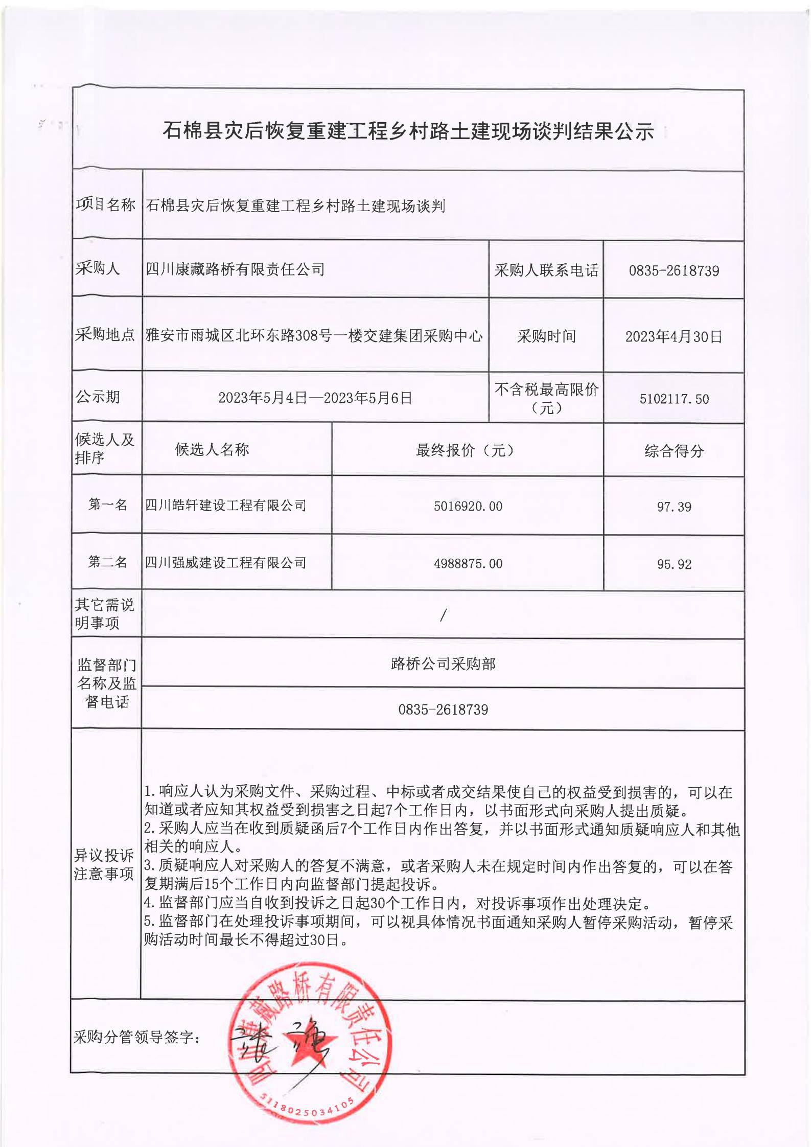 四川康藏路橋有限責任公司石棉縣災后恢復重建工程鄉(xiāng)村路土建現(xiàn)場談判結(jié)果公示