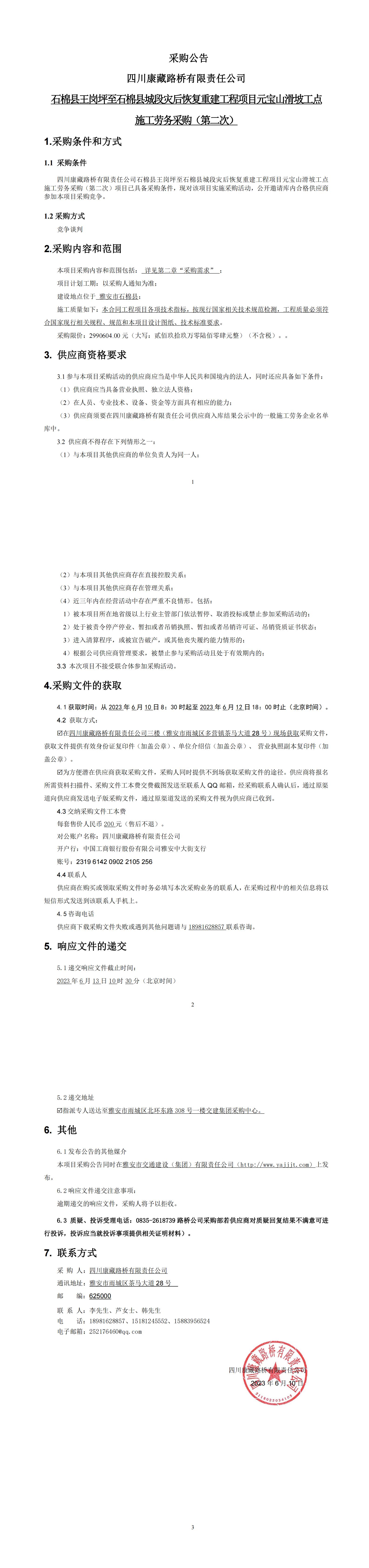 四川康藏路橋有限責任公司石棉縣王崗坪至石棉縣城段災后恢復重建工程項目元寶山滑坡工點施工勞務(wù)采購(第二次)