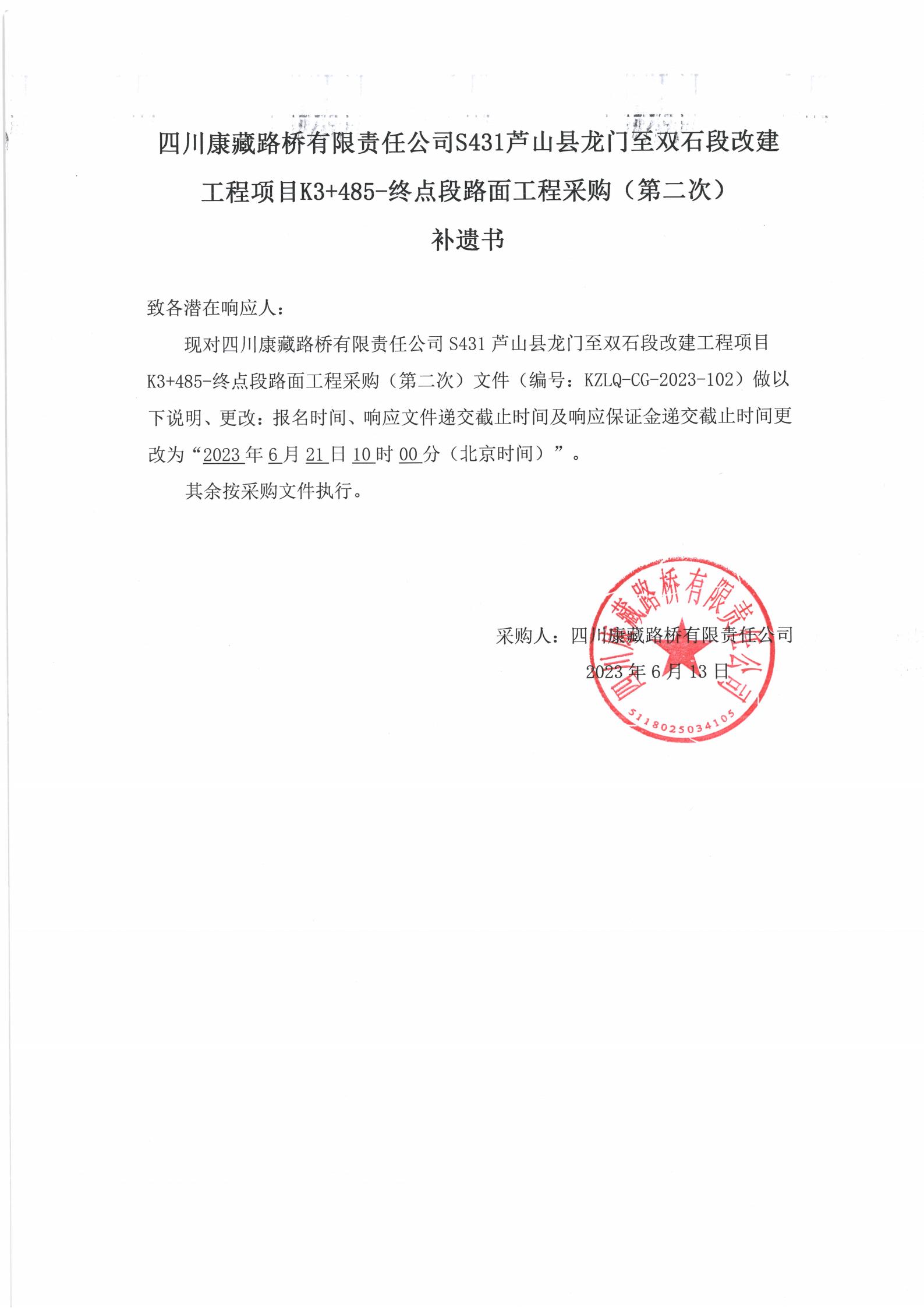 四川康藏路橋有限責(zé)任公司S431蘆山縣龍門至雙石段改建工程項目K3+485-終點段路面工程采購(第二次)補遺書