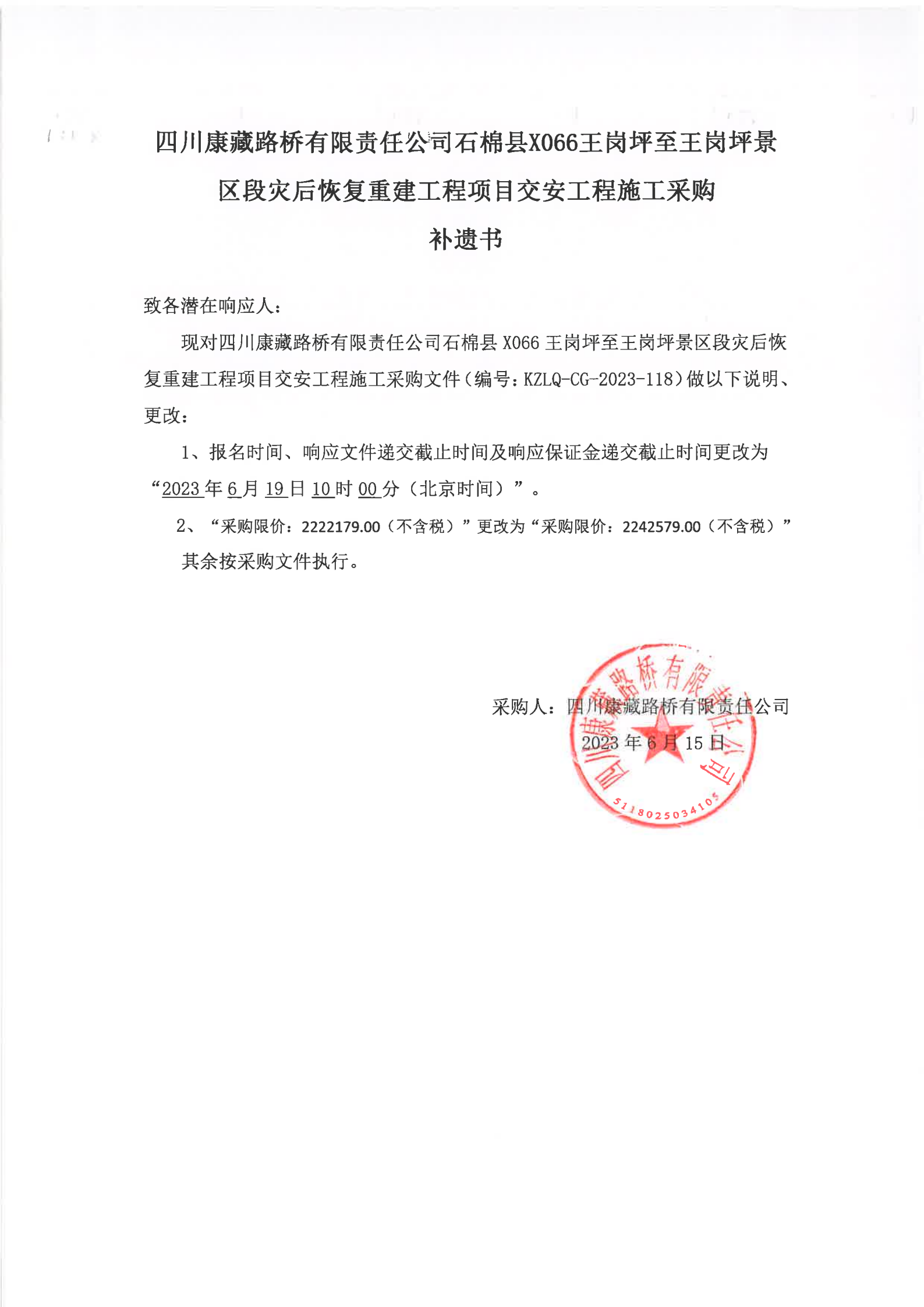 四川康藏路橋有限責任公司石棉縣X066王崗坪至王崗坪景區(qū)段災(zāi)后恢復(fù)重建工程項目交安工程施工補遺書