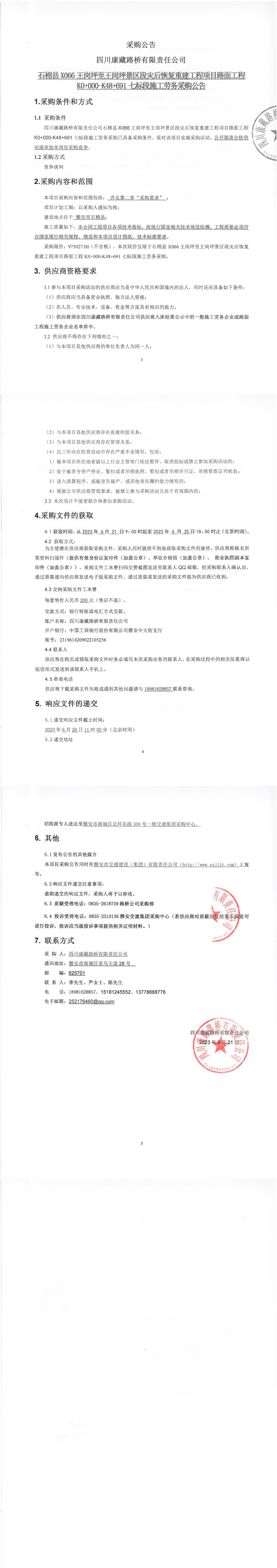 四川康藏路橋有限責(zé)任公司石棉縣X066王崗坪至王崗坪景區(qū)段災(zāi)后恢復(fù)重建工程項目路面工程K0+000-K48+691七標(biāo)段施工勞務(wù)采購公告