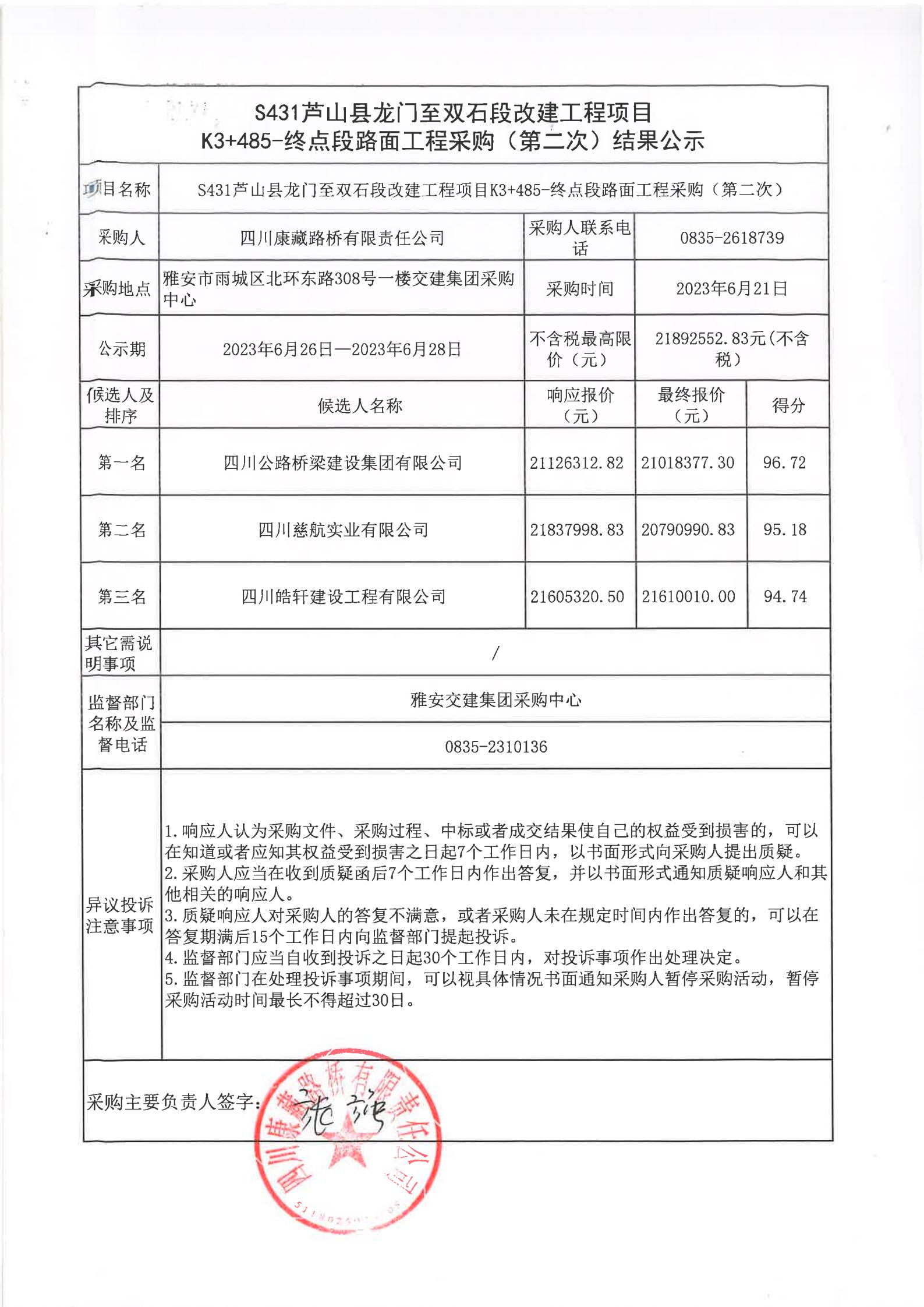 四川康藏路橋有限責(zé)任公司S431蘆山縣龍門至雙石段改建工程項(xiàng)目K3+485-終點(diǎn)段路面工程采購(gòu)(第二次)結(jié)果公示